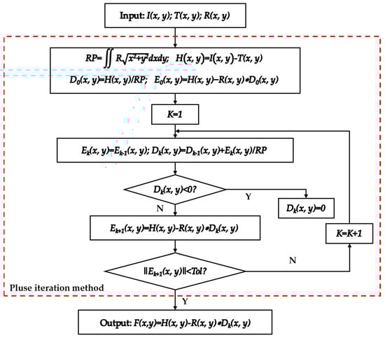 The material removed from the cylindrical surface can be obtained from the convolution of the dwell time and the tool removal function along the contour path [15]. By controlling the dwell time of the action area on the polishing track, the prescribed amount of material can be removed at each point. Figure 4 explains the pulse iteration method [16], where I(x,y) denotes the initial surface error, T(x,y) is the expected surface error after figuring, H(x,y) is the material removal distribution function, R(x,y) is the removal function, Ω is the action area of the removal function, RP is the removal pulse within the action area, Ek(x,y) is the residual error, Dk(x,y) is the dwell time calculated by pulse iteration method, F(x,y) is the surface error after simulation processing, and Tol is the convergence accuracy. The dwell time of the polishing area at different positions on the cylindrical surface can be calculated by pulse iteration method, and then the CNC (Computer Numerical Control) program that controls the implementation of the dwell time can be produced by the post-processing algorithm [17].