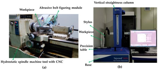 Machining and measuring device: (a) The abrasive belt-based figuring device; (b) the cylindricity measuring instrument.