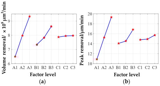 Removal rate under different factor levels: (a) Volume removal rate; (b) peak removal rate.