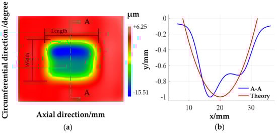 The volume material removal rate of this removal function is 5.82 × 108 μm3/min, the peak material removal rate is nearly 1.33 μm/min, the contour length in the axial direction is 30 mm, which is almost equal to the sum of the contact wheel width and the oscillation amplitude. The contour width in the circumferential direction is about 25 mm, and a in the theoretical analysis above is taken as 12 mm. The normalized contour and theoretical contour at the axial symmetry position of the removal function are plotted in Figure 9b. According to the Hertz contact theory, the material removal depth curve is theoretically parabolic, but due to the installation error, the workpiece axis and the machine tool tips connection are not in the same horizontal plane, so that the pressure distribution and the material removal depth is not uniform. The requirements for workpiece alignment are not high using this figuring method. Deterministic figuring process can be achieved as long as the contact state between the contact wheel and the workpiece during the actual figuring process is consistent with the removal function production process. The results show that the contour shape of the removal function obtained by the experiment is similar to the normalized contour shape of the theoretical analysis.