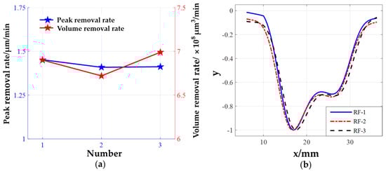 Removal function stability refers to the removal efficiency of removal function and the stability of geometric shape within a certain figuring time [22]. High material removal rate stability in a long-time polishing process is necessary for deterministic figuring. To verify the stability and repeatability of the removal function, experiments on 45 steel cylindrical workpieces were performed three times under the optimal experimental parameters as listed in Table 2, and the polishing time for each experiment was 15 min. The 45 steel cylindrical workpiece was initially prepared by precision turning. The variation curves of the peak and volume removal rate of different removal functions are plotted in Figure 10a, the stability of the volume removal rate is about 3.02%, and the stability of the peak removal rate is about 3.93%. The removal function profiles at their axially symmetric positions are extracted to compare their contour shape. Figure 10b shows the normalized profiles of different removal functions under the same parameters, and RF-X represent different removal functions in the plot. The ratio of the maximum deviation of the contour width of the three removal functions to the maximum contour width is calculated to characterize the shape change rate. The absolute value of the ratio is less than 5%. According to above results, the removal function of abrasive belt-based figuring exhibited excellent stability and repeatability, which verifies the removal function for deterministic machining of shaft parts can meet the figuring requirements for high efficiency and high material removal stability.