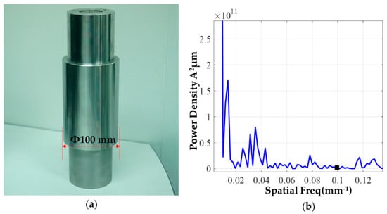 The actual contour of any machined surface always covers the geometrical error of the surface roughness profile, the waviness profile and the macroscopic shape profile [26]. Mathematical filtering can be applied to the roundness profile, to separate out the roughness from the general form. During the deterministic correction of roundness error, the shape error of low spatial frequency is emphasized. Through surface filtering, the mid-high frequency error components that cannot be corrected by the specific removal function can be filtered out, thereby reducing the actual machining residuals [27]. Figure 12a shows the workpiece after precision turning process and Figure 12b shows the spatial frequency distribution of the workpiece’s circular contour. It is shown that the circular contour covers a lot of low-frequency components, and the spatial wavelength of more than 90% of the contour is greater than 10 mm. Before using the surface error to calculate the dwell time, 10 mm Fourier low-pass filtering pre-processing is performed on the surface error in order to avoid excessive speed fluctuations during the figuring process. Based on the analysis of the figuring ability of the removal function, the removal function made under the optimal parameters can effectively correct the surface shape error after filtering.