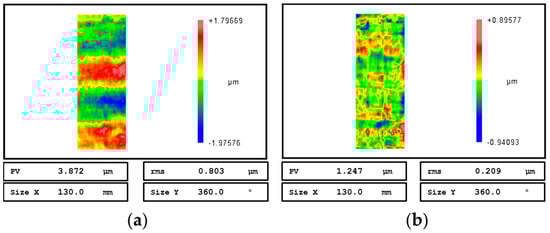 The initial and final roundness error surfaces are shown in Figure 13a and Figure 13b respectively. The results reveal that the PV value of the entire cylindrical surface after deterministic figuring for two iterations is improved from 3.872 μm to 1.247 μm, and the error convergence ratio is 3.11.