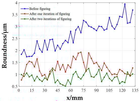 The curves of roundness error value at different axial positions before and after figuring experiments are plotted in Figure 14. Roundness error curves before experiment i.e., after precision turning process, after figuring once and twice are shown in blue, red and green lines, respectively. According to the result, the roundness error at different axial positions of the experimental workpiece before figuring are overall larger than 1.5 μm, some even larger than 3 μm, and the roundness error gradually increases as the turning tool moves away from the clamping position result from clamping eccentricity error. After figuring for two iterations, the roundness error values are mostly less than 1μm, and the minimum roundness error value is 0.51 μm.
