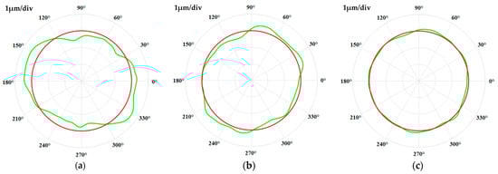 The shape of the circular contours at the same axial position before and after figuring in the case where the scale is 1 micron per division are illustrated in Figure 15. Circular contour shape before figuring experiment i.e., after precision turning process is shown as Figure 15a, contour shape after figuring once and twice are shown as Figure 15b,c, respectively. Obviously, there exists a clamping eccentricity error, which makes the contour shapes elliptical after the precision turning process. The shape variations at the same axial position before and after the figuring experiment reveal that the high points on the circular contour gradually decreased, and the low points increased relatively, the elliptical contour is gradually close to the least square circle after the deterministic figuring for two iterations. This verifies that the deterministic correction of roundness errors can be obtained using abrasive belt-based figuring method.