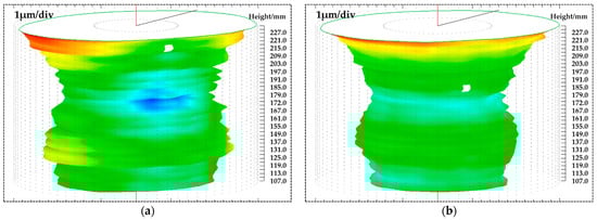 The cylindricity diagrams before and after figuring are shown in Figure 16a and Figure 16b, respectively. The cylindricity errors before and after figuring operations are 9.17 μm and 7.79 μm. There is a slight improvement after figuring experiments. This paper mainly deals with the improving of roundness profile, there is no control over the cylindricity. While improving the roundness error, it is possible to worsen the cylindricity because there will be local changes in the axis of the cylindrical workpiece during roundness figuring process.