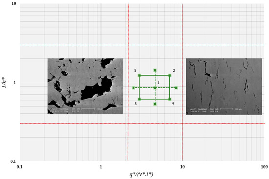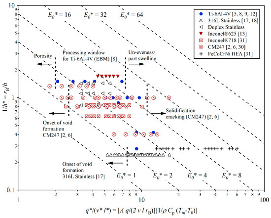 Thomas et al. [6] developed the normalised process diagram as a means of illustrating the process window for various ALM alloying systems including Ti, Ni and steel alloys, where the vertical axis acts as a function of normalised hatch spacing and the horizontal axis as the remaining key process variables (beam power, beam velocity, and layer height), as reproduced here in Figure 1 with their relevant notations indicated in Table 1. Diagonal isopleths indicate the varying degrees of energy density (E*), based on these key process variables, with the top right region being considered high energy and the bottom left considered low energy. Carter et al. [7] established that for high γ′ Ni-based alloys fabricated through LPBF, the process window is extremely narrow. High energy densities have given rise to multiple microcrack forming mechanisms, namely solidification cracking and ductility dip cracking. Conversely, low energy densities have been shown to promote microvoid formation as a result of the energy density not being sufficient enough to reach the minimum energy threshold and subsequently achieve full powder melting and consolidation.