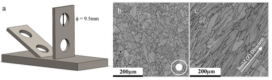 (a) 30° and 90° build orientations with sectioning locations, (b) 30° build microstructure, and (c) 90° build microstructure.