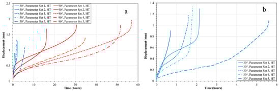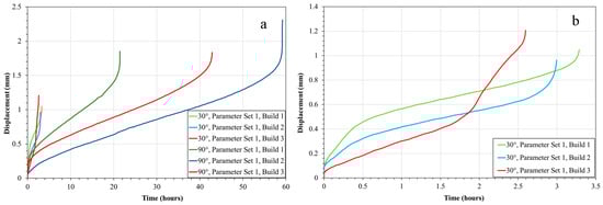 (a) SP creep results for 30° and 90° builds across the five Parameter Sets; (b) 30° build orientation results.