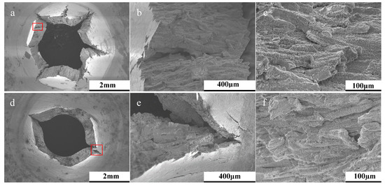 Post-rupture fractography of (a–c) 30° build orientation and (d–f) 90° build orientation.