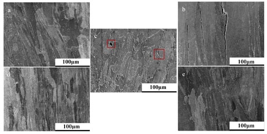 Microstructural features of 90° specimens for the 5 different parameter sets (a) 5, (b) 2, (c) 1, (d) 3, (e) 4 in relation to the DOE testing matrix given in Figure 3.