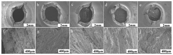 SP creep fractography across DOE parameter sets for 90° build orientations. Parameter set (a,f) 1, (b,g) 2, (c,h) 3, (d,i) 4, (e,j) 5.