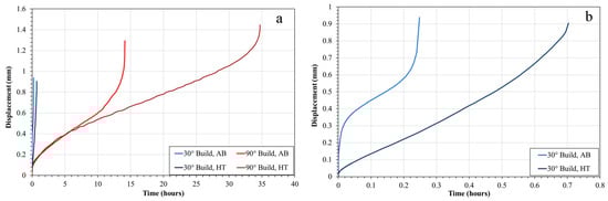 (a) SP creep of 30° and 90° samples both in the as-built and post-processed condition; (b) 30° build orientation results.