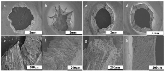 Post-rupture fractography of 30° Parameter Set 2 AB (a,e), HT (b,f), and 90° Parameter Set 2 AB (c,g) and HT (d,h).
