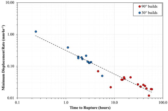 Despite the factors discussed playing a role on the elevated temperature creep properties of LPBF CM247LC, a final consideration should be made regarding the consistency of the test. Previous literature has demonstrated the validity of the Monkman-Grant relationship for small punch test data [23]. Figure 13 displays a modified Monkman-Grant relationship for the suite of tests conducted within this research, with a clear linear relationship and correlation between Time to Rupture and Minimum Displacement Rate. Limited scatter is apparent, supporting the repeatability of the test arrangement, whilst it is also evident that 30° builds exhibit a far inferior resistance to high-temperature mechanical deformation.