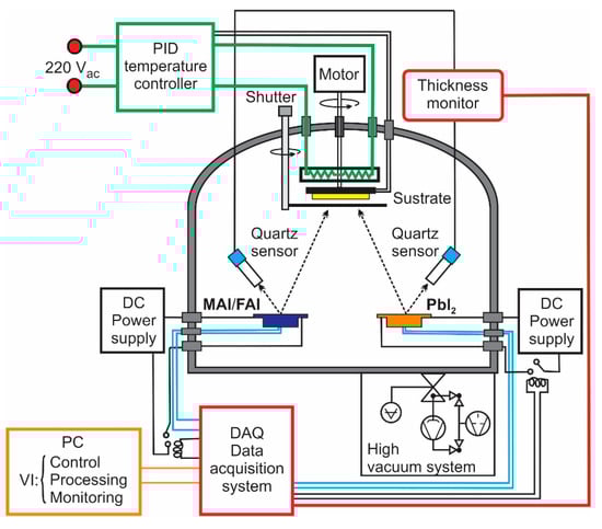 Scheme of the system used to grow CH3NH3PbI3 (MAPI) or (NH2)2CHPbI3 (FAPI) films by sequential evaporation of precursors. PID: proportional integral derivative control algorithm.