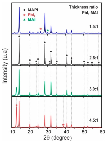 X-ray diffraction spectra of MAPI films prepared varying the lead iodide (PbI2)/MAI thickness ratio.