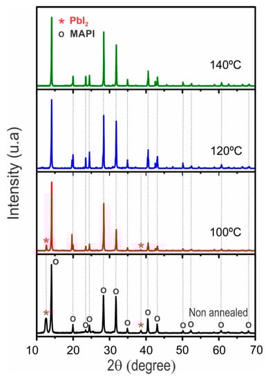 From this result can be seen that the transmittance at wavelengths lower than λc of MAPI films prepared with excess of PbI2, decreases significantly when these are annealed at temperatures of 140 °C, indicating that this type of annealing prevents the secondary phase formation. This result agrees with those obtained through XRD measurements (Figure 3).