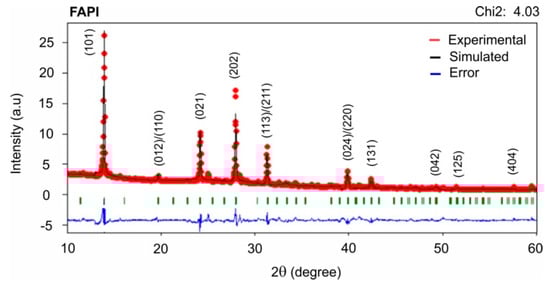 The crystalline structure of a typical MAPI sample prepared under a PbI2/MAI thickness ratio of 2.6:1, as well as the indices of Miller associated to the identified reflections were determined by comparing the experimental XRD spectrum with a theoretically simulated difractogram, using the FullProf program; the simulation was done assuming samples with known crystalline structure and group of symmetry and additionally using crystallographic parameters reported in the literature [19,21,22]. The simulation performed fitted quite well to the experimental results (Figure 4 with chi-squares less than 4). From these results was established that this type of MAPI films grows with tetragonal structure and I4cm symmetry group.