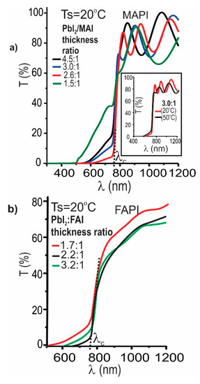 The influence of chemical composition and post deposition annealing on the optical properties of MAPI films was studied through spectral transmittance and reflectance measurements. Figure 7a shows the transmittance spectra of MAPI films prepared at room temperature, varying the PbI2/MAI thickness ratio; the inset show transmittance curves of MAPI films prepared under a thickness ratio of 3:1 and deposited varying the substrate temperature between 20 and 50 °C. In Figure 7b are also shown transmittance spectra of FAPI films prepared at room temperature, varying the PbI2/FAI thickness ratio.