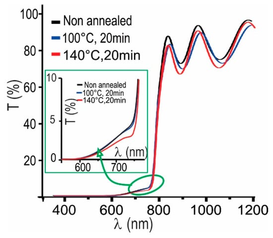 Figure 8 shows the effect of the annealing temperature on the spectral transmittance of MAPI films prepared under a PbI2/MAI thickness ratio of 3:1.