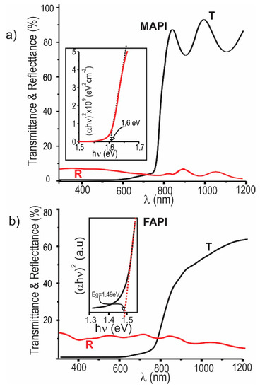 Figure 9 shows transmittance and reflectance spectra corresponding to typical MAPI and FAPI samples free of secondary phases and in the inset are displayed curves of (αhν)2 versus hν used to determine the Eg value. It was found that MAPI and FAPI films have energy gaps of 1.60 and 1.49 eV respectively, these agrees with Eg values reported by other authors [37].