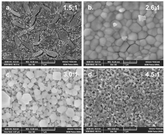 The influence of chemical composition and post deposition annealing temperature on the morphology of MAPI and FAPI films was studied through SEM measurements. Figure 10 shows SEM images corresponding to MAPI films prepared at room temperature varying the PbI2/MAI thickness ratio. This study reveals that the morphology of the MAPI films is affected by both, the chemical composition and annealing temperature. In particular, it is observed that the samples prepared with excess of MAI (1.5 to 1 ratio) present formation of large and elongated clusters (≈ 0.3 × 0.8 µm) surrounded by grains of nanometric size. Taking into account the results of XRD that indicate that samples deposited with excess of MAI present formation of the MAI phase, we believe that the observed clusters could correspond mainly to the compound MAI. On the other hand, samples prepared with excess of PbI2 (4.5 to 1 ratio) exhibit a porous morphology constituted by grains of sub-micron size of irregular shape. The SEM images also show that the MAPI samples prepared with chemical composition corresponding to a PbI2/MAI thickness ratio of 2.6:1 exhibit a morphology consisting of compact grain structures with sub-micron size; it was found that the grain size of this type of MAPI samples vary between 0.3 and 0.8 µm, with an average grain size of around 0.49 µm.