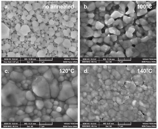 In Figure 11 are displayed SEM images of a MAPI film prepared at room temperature under a PbI2/MAI thickness ratio of 3:1 and annealed after deposition at temperatures ranging between 100 and 140 °C. These results show that post-annealing treatment induces significant changes in the morphology of the MAPI films, among which the following can be highlighted: