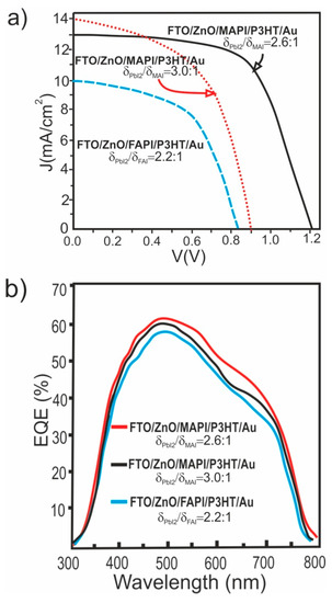 (a) J–V curve and (b) external quantum efficiency, of the best solar cell fabricated with structure FTO/ZnO/MAPI/P3HT/Au and FTO/ZnO/FAPI/P3HT/Au. : PbI2/MAI thickness ratio and : PbI2/FAI thickness ratio.