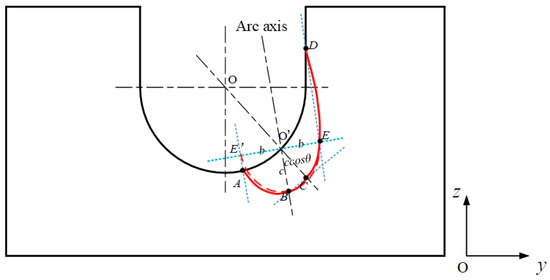 The wires are directed towards the sidewalls, and the groove is narrow and deep. Therefore, the heat source is different from that of the bead-on-plate welding. As shown in Figure 5, O’B is the arc axis, EE’ is the surface of the plate. E, E’ and B are the points where the heat flux decreases to 0.05q*max for bead-on-plate welding. The length of O’E and O’E’ is the b value, and the length of O’B is the c value. The groove is uniform in the x direction, so the value of a is independent of the orientation of the arc axis, which is in the yOz plane. However, the values of b and c will change with the arc axis orientation. A line is drawn passing through E and line parallel to the arc axis. The line and the sidewall meet at D, which is the point at which the heat flux decreases to 0.05q*max for narrow-gap welding. In the same way, on the surface of the groove bottom, A is the also the point where the heat flux decreases to 0.05q*max. If the line EE’ is rotated on the axis of O’ so that it is tangential to the groove surface, then C is the point at which the heat flux decreases to 0.05q*max. The length of O’C is c·cosθ. So in the yOz plane, the area bounded by the curve A-B-C-E-D-A is that in which the arc heat flux is distributed. It can be seen that, in narrow-gap welding, the heat distribution can be divided into two parts: One mainly distributed in the sidewall (CEDO’C) to melt the sidewall; the other (ABCO’A) distributed in the groove bottom to ensure the penetration depth. Using on the geometric relationships, it can be found that a great proportion of the heat will be transferred into the sidewall as b or c increases.