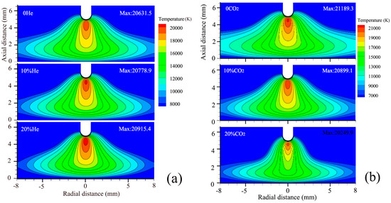 Arc temperature distribution under different helium (a) or CO2 contents (b) for bead-on-plate geometry; the CO2 content is 10% in (a) and the He content is 5% in (b).