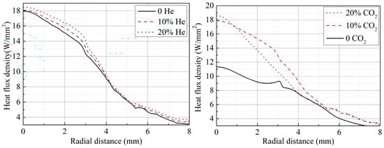 Heat flux density distribution for different helium or CO2 contents.