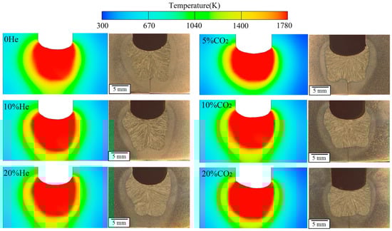 Based on the above discussion, the heat source models for different shielding compositions were modified according to the weld shape. The predictions of the model using the heat source models are given in Figure 8, with the measured weld cross-section also shown. In the images, the left is the side of the lead wire and the right is the side of the trail wire. It can be seen that the fusion line of the molten pool and the fusion line of the weld are in good agreement. The weld shape in tandem with narrow-gap welding is asymmetrical. In the welding process, the lead arc heats the groove bottom surface directly, and when the molten pool on the side of lead wire forms, the molten metal flows to the trail edge of the pool. Hence, the trail arc works on the surface of the molten metal, so the depth of sidewall penetration of this side is shallower than the other side because of the cushion effect. The weld width increases with the increase of CO2 content (0–10%). When the CO2 content exceeds 10%, the arc length clearly decreases as the CO2 content increases [13], causing a decrease in the area of the arc root that acts on the sidewall, so the heat model geometrical parameters (a and b) decrease and the weld width decreases. Similarly, as the helium content increases, the arc length decreases and the weld width decreases when the helium content reaches 20%.