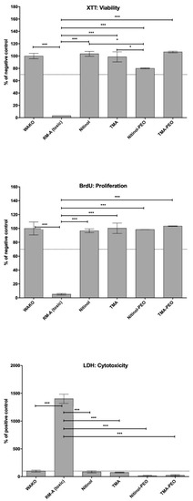 Cytocompatibility extract results achieved by XTT, BrdU and LDH assays. Statistical significant differences are as follows: * p ≤ 0.05 (significant different), ** p ≤ 0.01 or *** p ≤ 0.001 (high significant difference).