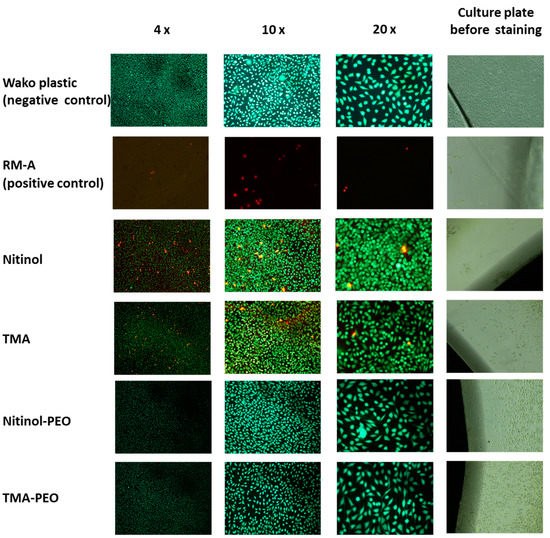 In the direct tests, all test materials and the negative control showed mostly green living and adherent cells compared to the positive control, on which fewer and red dead cells were visible (Figure 3). Interestingly, a few red dead cells were visible on the untreated NiTi and β-Ti, while both ceramized pendants were comparable with the negative control.