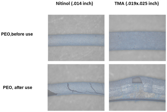 The stereomicroscopic examination showed PEO-coatings along the entire surface of both archwires (Figure 4). The grey color of the NiTi and β-Ti archwires gleamed slightly through the PEO-coatings. Deformation of the archwires resulted in cracks in the PEO-layers and peeling of the PEO-coatings.