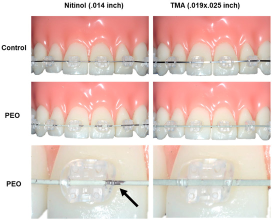 This procedure was repeated three times using the same archwire. Both archwires could be easily inserted in the slots of the ceramic brackets and the clinical handling of PEO-coated archwires was not different from that of non-coated control wires.