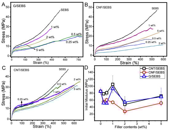 | 0.5 wt.% | 0.5 CNF/SEBS | 0.5 CNT/SEBS | 0.5 G/SEBS |