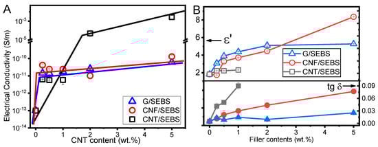 - Costa, P.; Silva, J.; Sencadas, V.; Simoes, R.; Viana, J.C.; Lanceros-Mendez, S. Mechanical, electrical and electro-mechanical properties of thermoplastic elastomer styrene-butadiene-styrene/multiwall carbon nanotubes composites. J. Mater. Sci. 2013, 48, 1172–1179. [Google Scholar] [CrossRef]
