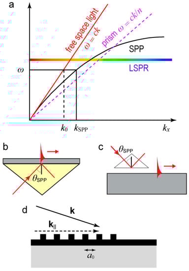 The demonstrative dispersion curve of SPP () for a metal/free space (dielectric medium, ) interface is plotted as Figure 2a. At the same frequency, is always larger than . From the free space, simply shining a laser beam at this interface cannot excite a SPP. However, a prism made of glass () can be used to match with proper coupling methodologies. In Kretschmann (Figure 2b) and Otto (Figure 2c) coupling methodologies, an evanescent wave from the total internal reflection (TIR) at the metal/prism interface is used to generate SPP at the metal/free space interface. In addition, the evanescent wave of the SPP penetrates into both the metal layer and the dielectric medium with a defined depth and , as shown in Figure 1. Take a gold/air interface, penetration depths are 328 nm and 28 nm into air and gold separately at 633 nm incident light [53]. These numbers demonstrate that SPP is highly confined at the interface. Gratings also can be used to match the wave vector of a SPP, as shown in Figure 2d. Later coupling techniques based on fibers/waveguides have also been developed [54].