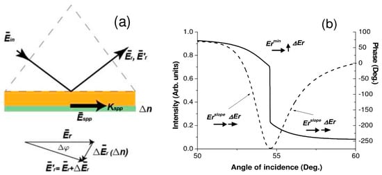 In Figure 4a, the reflected electric vector at the initial resonance condition and the one after a happened next to the metal thin film for an altered resonance condition are presented. Figure 4b compares the reflection intensity and the phase shift against incident angle. A much steeper change around the resonance angle can be observed for the phase curve. This work demonstrates that the LOT of a phase interrogation on the RI change could reach 10−8 and even 10−9 RIU [60]. Later, novel phase interrogation methodologies have been proposed to further increase the detection sensitivity [61,62] and have been applied in prominent biosensing devices [63,64].