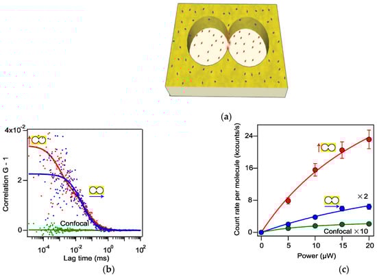 To enhance the light-matter interaction, a double nanohole plasmonic design has been used to enhance fluorescence intensity by Regmi et al. [82]. As shown in Figure 5a, LSPR generates nanoscale hot spots at the tips of the double nanohole. With an incident laser beam polarized parallel to the apex region, the locally enhanced nearfield can enhance the fluorescence. Dye molecules near these tips have enhanced fluorescence, and molecules in the double nanohole void are also excited by the incident light without any enhancement, but molecules on top of the gold surface cannot be excited. As shown in Figure 5b, the fluorescence correlation spectroscopy measurements for polarization parallel (red color) and perpendicular to the apex region (blue color), and the fluorescence measurement using a confocal microscope (green color) are plotted to demonstrate the enhancement of fluorescence by using a double nanohole at LSPR. In addition, in Figure 5c, the brightness of fluorescence for these three cases are compared at different incident powers. For clearness, the count was doubled for the perpendicular polarization case and was multiplied by 10 for the confocal measurement. With a double nanohole, the enhancement of fluorescence can be as high as 100-fold.