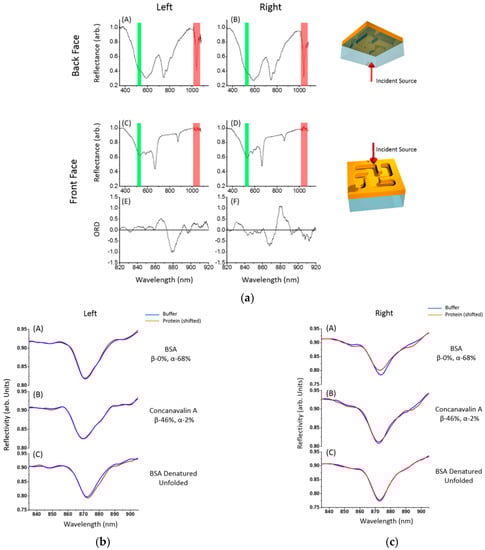 Most biomolecules are chiral, and chirality can be crucially important, e.g., for a drug molecule. Plasmonic planar chiral metamaterials has been researched to generate chiral electromagnetic (EM) fields to probe chiral molecular structure [87]. As shown in Figure 6a, the reflection spectra from the back-face illumination, the front-face illumination, and its optical rotatory dispersion (ORD) are plotted for the left-handed and right-handed gammadions respectively. Demonstration of both illumination schemes and the sketch of the plasmonic design are also shown. In Figure 6b,c, the measured reflectivity using left-handed and right-handed structures are plotted respectively for 3 types of proteins. These proteins do not show clearly difference from buffer solution when using left-handed structure, while clearly shifts are observed with right-handed structure for natural BSA. Comparing between the natural and denatured BSA protein, it is clearly that this design is sensitive to the second structural information of proteins. The measured differences in the effective refractive indices of chiral samples exposed to left- and right-handed chiral fields generated by these plasmonic nanostructures are found to be up to 106 times greater than those observed in optical polarimetry measurements.
