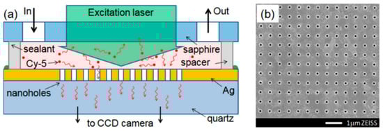 Along with the fast development in nanofabrication techniques, nano-optics has been boosted and applied in various research and industry areas. Plasmonics is one major branch of nano-optics. Due to its ability to generate nanoscale hot spots which are close to the size of bioparticles, it has been applied in biosensing broadly with enhanced sensitivity for refractive index (RI) changes and enhanced light/matter interactions [1,2,3,4,5]. For example, prostate-specific antigen has been detected with a visual limit of detection (LOD) as low as 0.0093 ng/mL [6]; with the mechanism that glucose oxidase can control the growth of nanoparticles, an inverse sensitivity has been achieved as low as 4 × 10−20 M [7]; nanohole array has been used to detect exosomes with the LOD as approximately 670 × 10−18 M and potential cancer diagnose without biopsy is possible based on this technique [8], and other applications in bio-interfacial research [9], heavy ions in water [10], foodborne pathogen [11], and drug delivery [12] have been carried out. Some of the plasmonic devices have already been developed into portable manner toward point-of-care (PoC) applications [13,14,15].