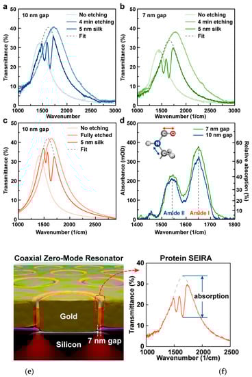 Transmission spectra for no etching, after etching and silk coated conditions for (a) 10 nm and (b) 7 nm wide nanogap respectively. (c) Simulated transmission spectra using 10 nm wide nanogaps under three conditions are plotted for comparison. (d) Absorption of 5 nm silk by using 10 nm and 7 nm wide nanogap. (e) Schematic presentation of nanogap-based coaxial zero-mode resonator. (f) Fitting curve is used in transmission spectra to demonstrate the absorption intensity. Adapted from [99], with permission © 2018 American Chemical Society.