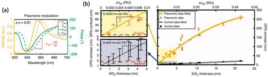 (a) Intensity (yellow color) and phase (green color) profiles for 0.01 RIU change. (b) OPD contrast comparison between this plasmonic sensor (orange color) and a transparent substrate (grey color) for different thickness of SiO2 cover layer. Zoomed in range for thin SiO2 is plotted separately for this plasmonic sensor (left top plot) and a transparent substrate (left bottom plot). Adapted from [104], with permission © 2018 Springer Nature Publishing AG.