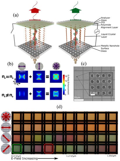 - Bartholomew, R.; Williams, C.; Khan, A.; Bowman, R.; Wilkinson, T. Plasmonic nanohole electrodes for active color tunable liquid crystal transmissive pixels. Opt. Lett. 2017, 42, 2810–2813. [Google Scholar] [CrossRef]