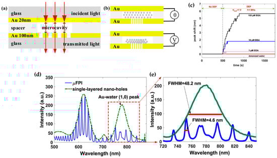A nanohole array has been explored to combine with a microfluidic system to transport biomolecules [142]. However, for a nanosize hot spot, bioparticles from a low concentration solution still need long waiting times to get close to the nanoscale sensing area to be detected. To solve this issue, dielectrophoresis (DEP) technique has already been combined with plasmonic devices. A sensor consists of a Au thin film as the top electrode and a Au thin film fabricated with nanohole arrays as the bottom electrode, and it uses DEP to transport biomolecules [143]. In Figure 11a, a nanohole (200 nm in diameter) array in 100 nm thick Au film is used as the lower electrode and the upper Au electrode has a thickness of 20 nm. For plasmonic sensing, EOT effect is applied. In Figure 11b, DEP is demonstrated for the cases without (top figure) and with an electrical potential (bottom figure). The DEP effect on transporting BSA proteins is demonstrated in Figure 11c and different concentrations are tested. In the first 500 s, no electrical potential is applied and no protein is detected. Then DEP effect is activated, and proteins in different concentrations are all detected in a really short time. This result demonstrates an efficient protein transportation using DEP with this design. These two Au layers are also applied as reflection surfaces to form a FP resonance cavity. As shown in Figure 11d, the transmission profile is shown with a dash-dot line with two EOT peaks, and FP resonances can be observed as the blue curve. A zoomed in range of the transmission peak on the long wavelength side of the transmission spectrum is shown in Figure 11e. With the combination of using a micro FP cavity and the EOT effect of a nanohole array, LOD of this design is approximately 0.14 pM by assuming the noise level is 0.05 nm for the wavelength spectrum.