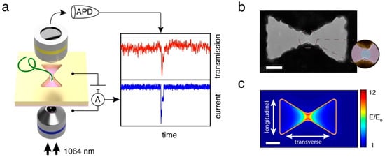 (a) Schematic representation of the plasmonic and electrical sensing mechanisms. (b) TEM image of the bowtie aperture. (c) Simulation result on E-field enhancement. Adapted from [144], with permission © 2018 American Chemical Society.