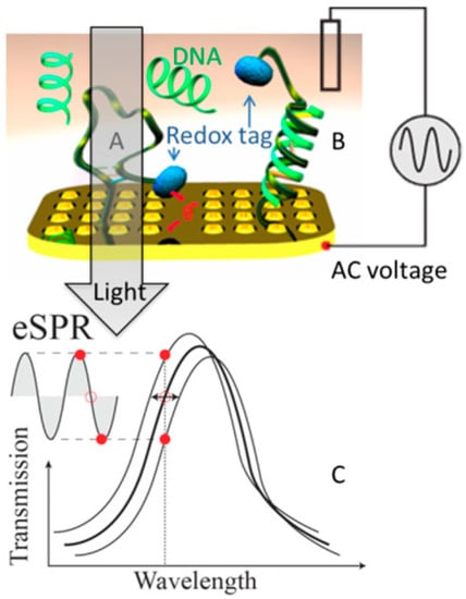 Schematic presentation for electrochemical SPR sensor. (A): redox tag attached directly on the surface of the sensor, (B): redox tag attached on a DNA, (C): transmission for A under a redox reaction. Adapted from [148], with permission © 2015 by WILEY-VCH Verlag GmbH & Co.